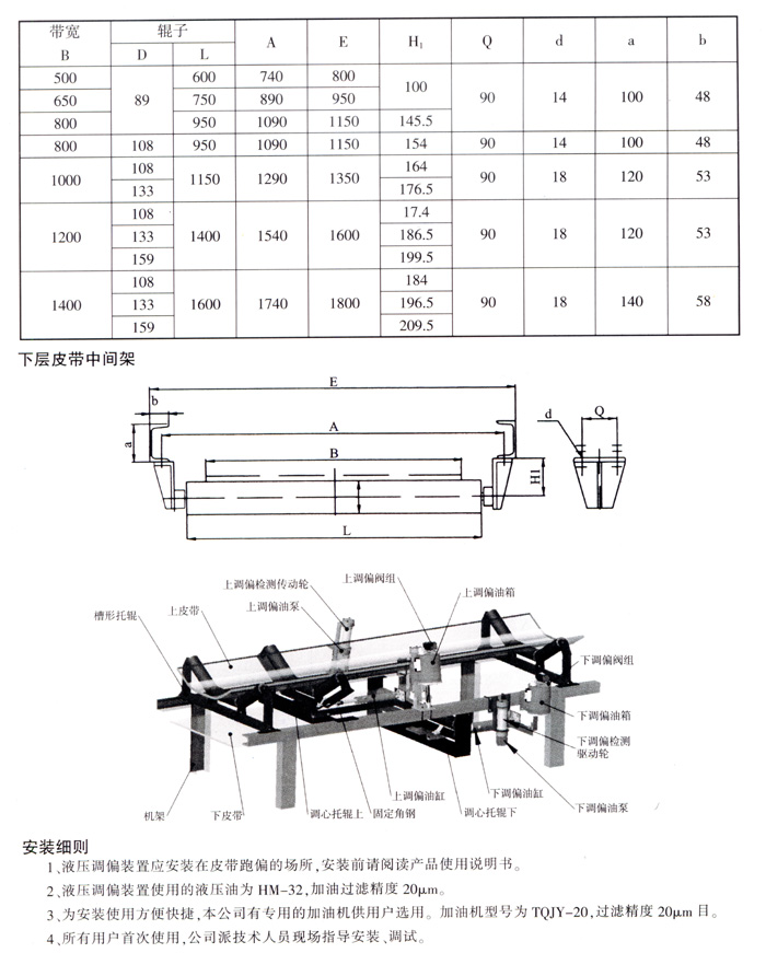 4、液壓調(diào)偏裝置根據(jù)皮帶機的單向運輸和雙向運輸兩種場所,分為單向調(diào)偏裝置和雙向調(diào)偏裝置兩個品種。